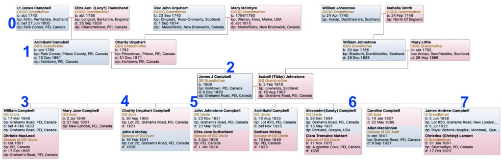 The information for these was collected and put together 20 odd years ago, so some changes and recent additions are not included. Should you wish to gain other Family Trees, from Lt. James Campbell, or Archibald Campbell or others, you can contact Steve Dimond : steve@stanleybridge.ca. A PDF could be sent along !